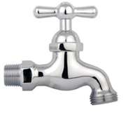 Durable 1/2” x 3/4” chrome hose bibcock with polished finish, curved spout, and cross handle for easy wall-mounted installation and modern style.